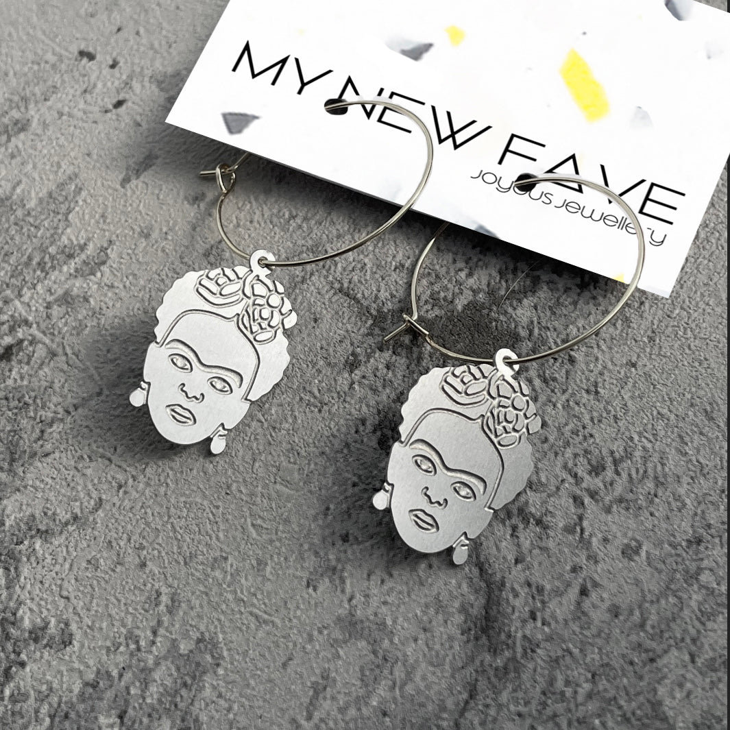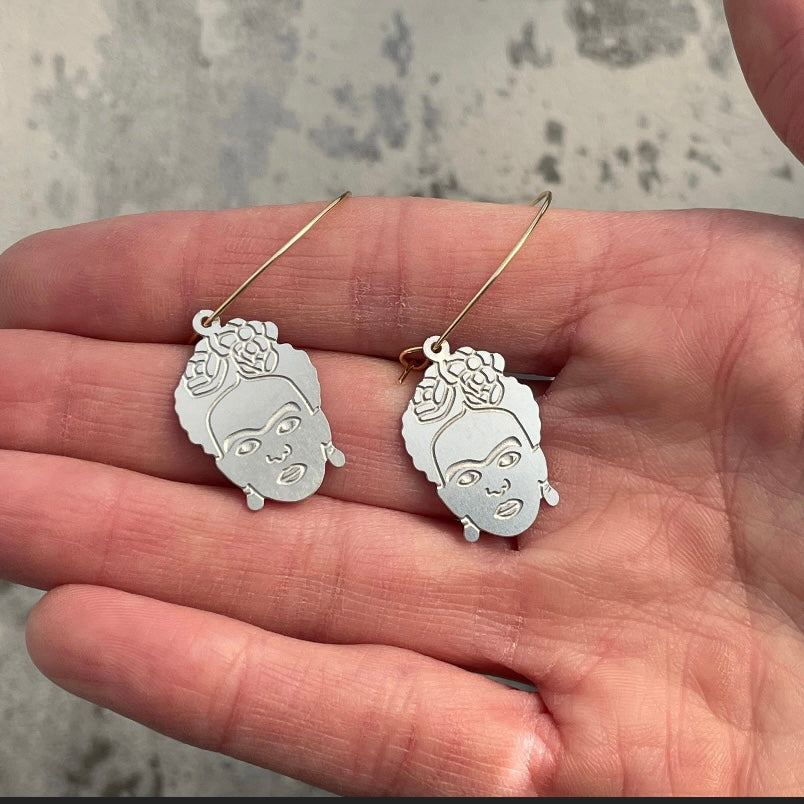The Frida design is etched into stainless steel and are hung on gold plated or silver plated hoops. Gold makes a nice contrast or choose silver to be more matching.