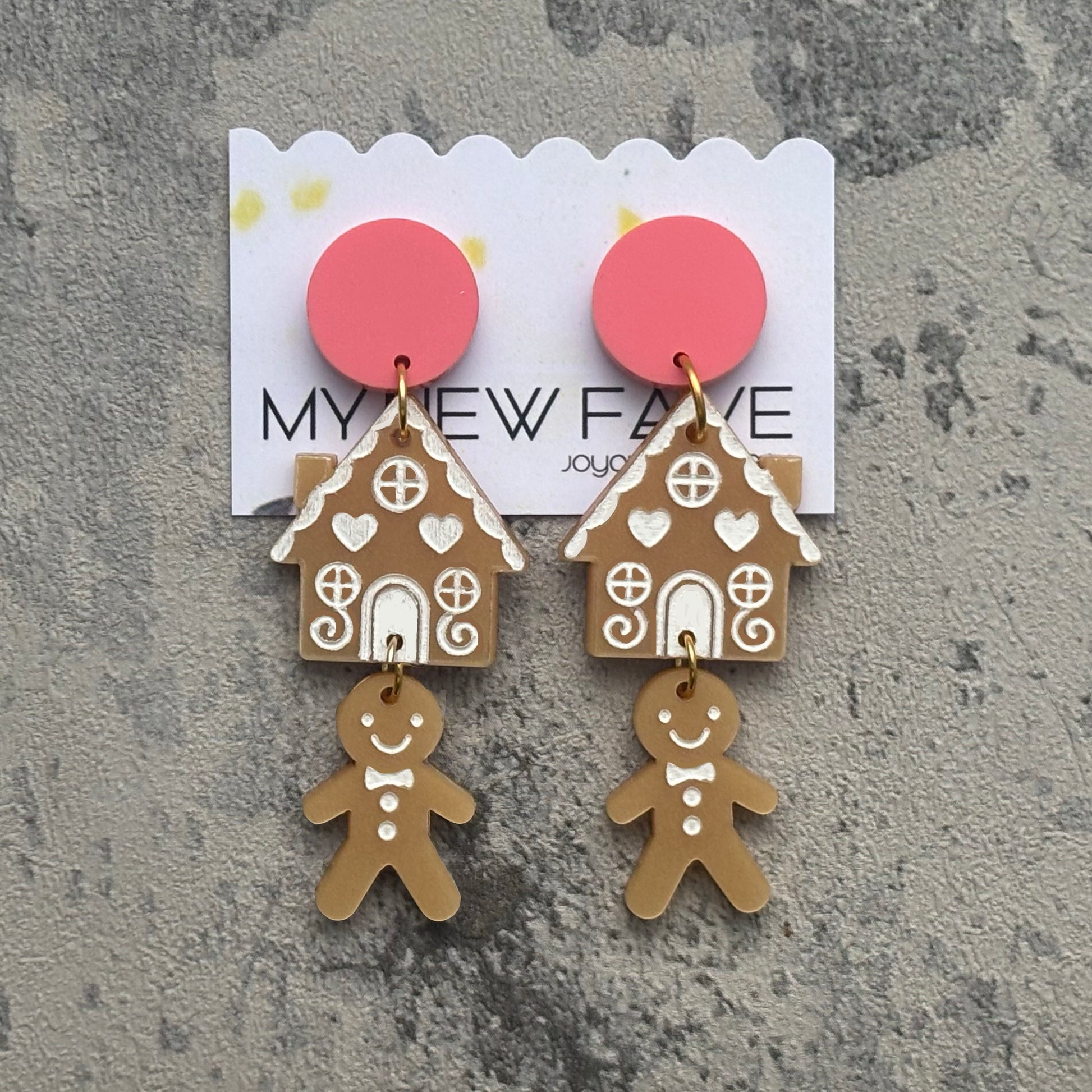 gold acrylic engraved with a gingerbread house design, with a gingerbread person hanging below. both hung from a cute matt pastel pink large round stud.