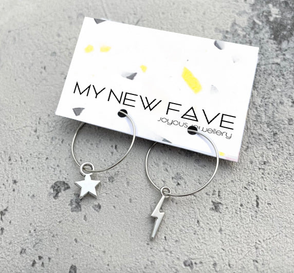 Dainty little lightning bolt & star shapes hang from small 20mm hoops which secure at the back. Available in silver colour or gold colour finish.