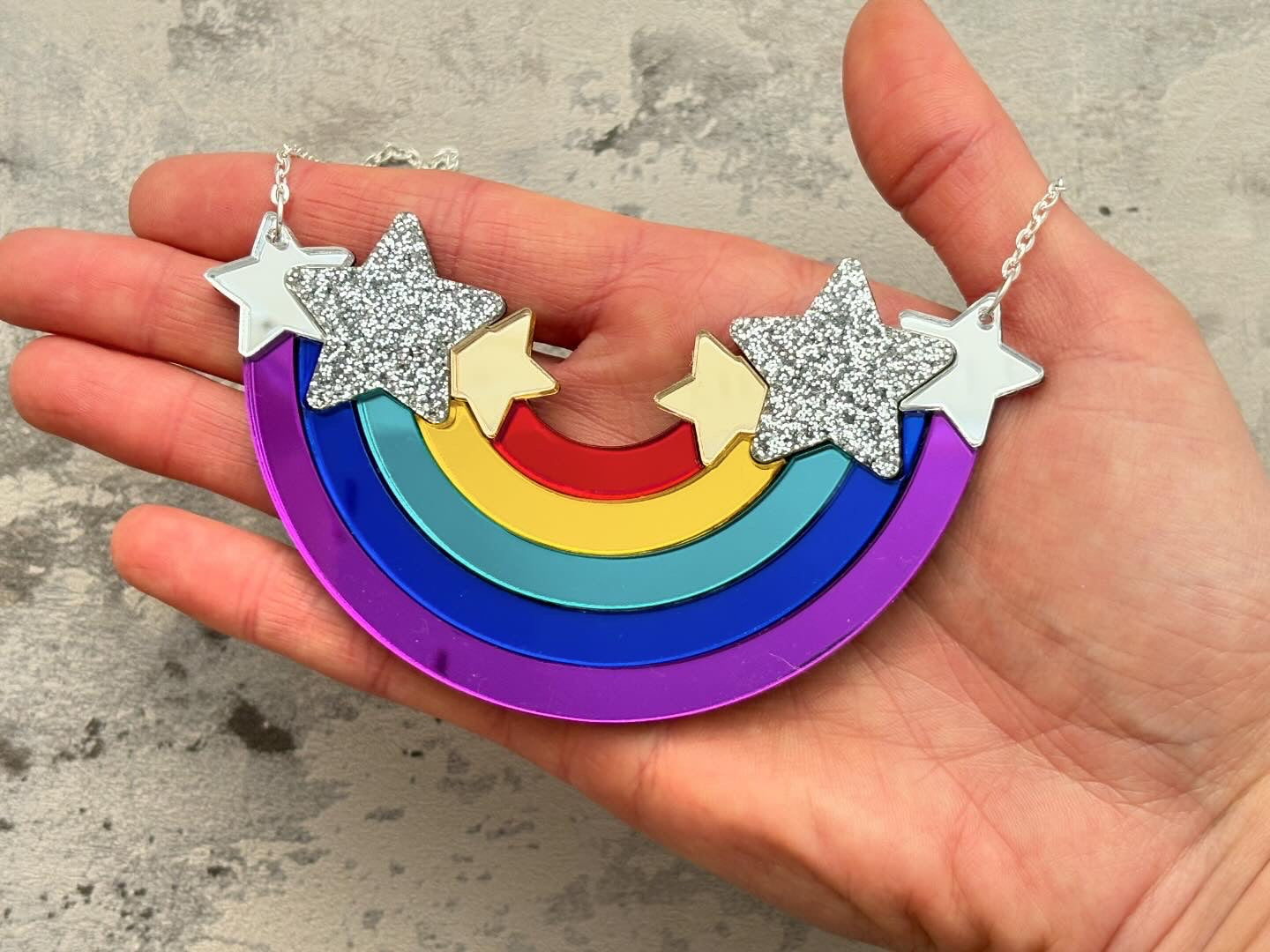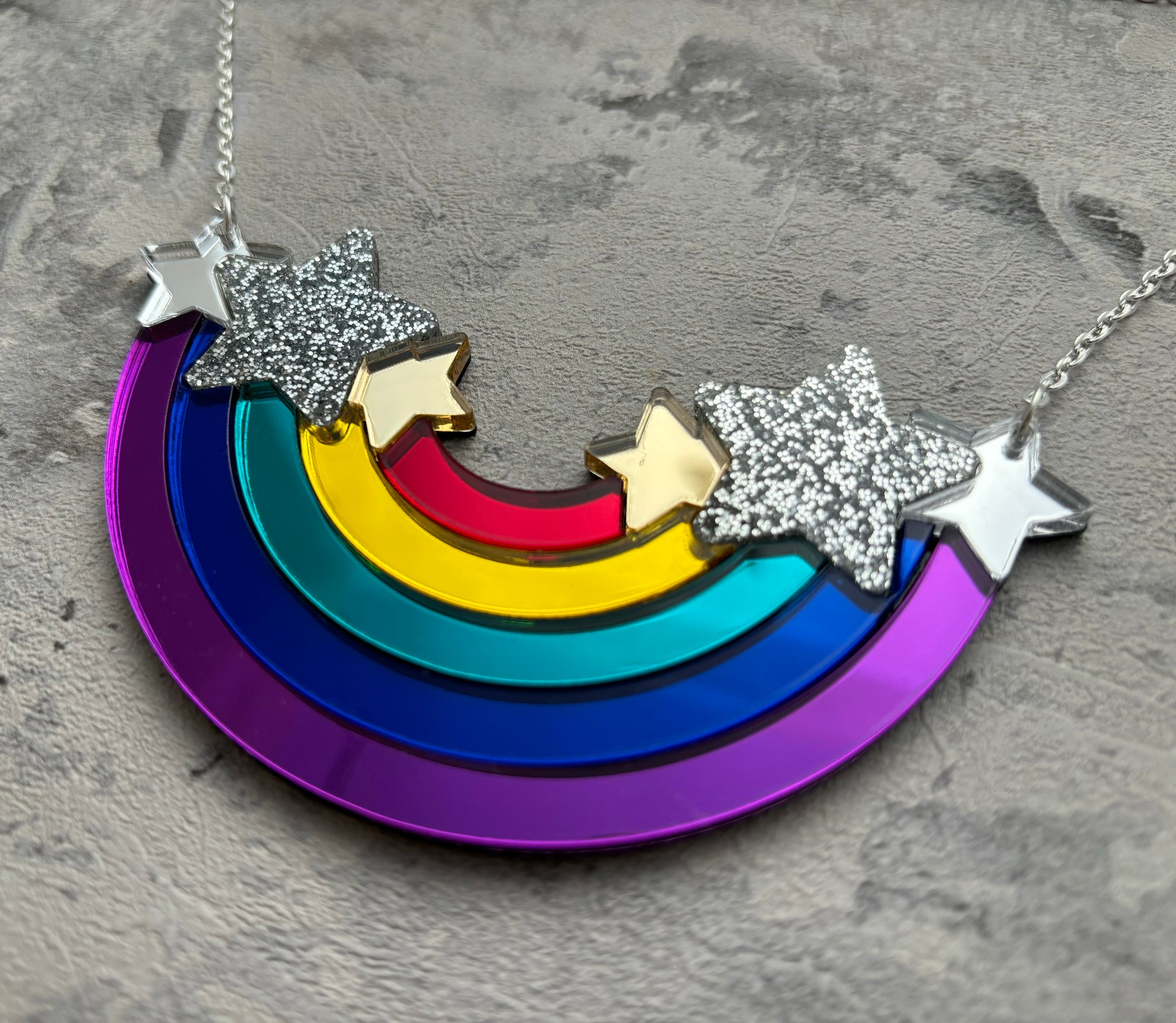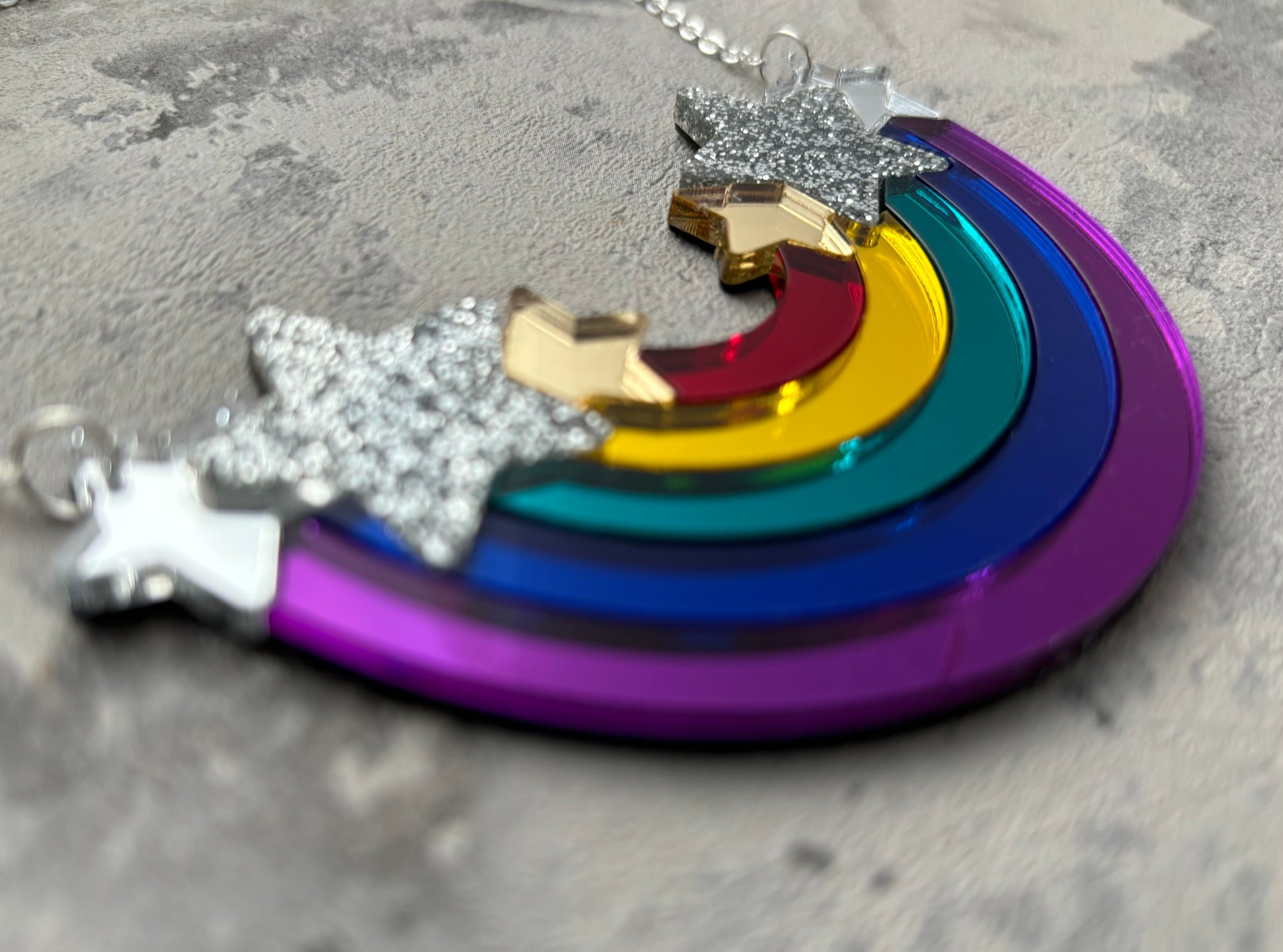 The rainbow and stars shape is made from colourful mirror acrylic mixed with super sparkley glitter & mirror acrylic for the stars.