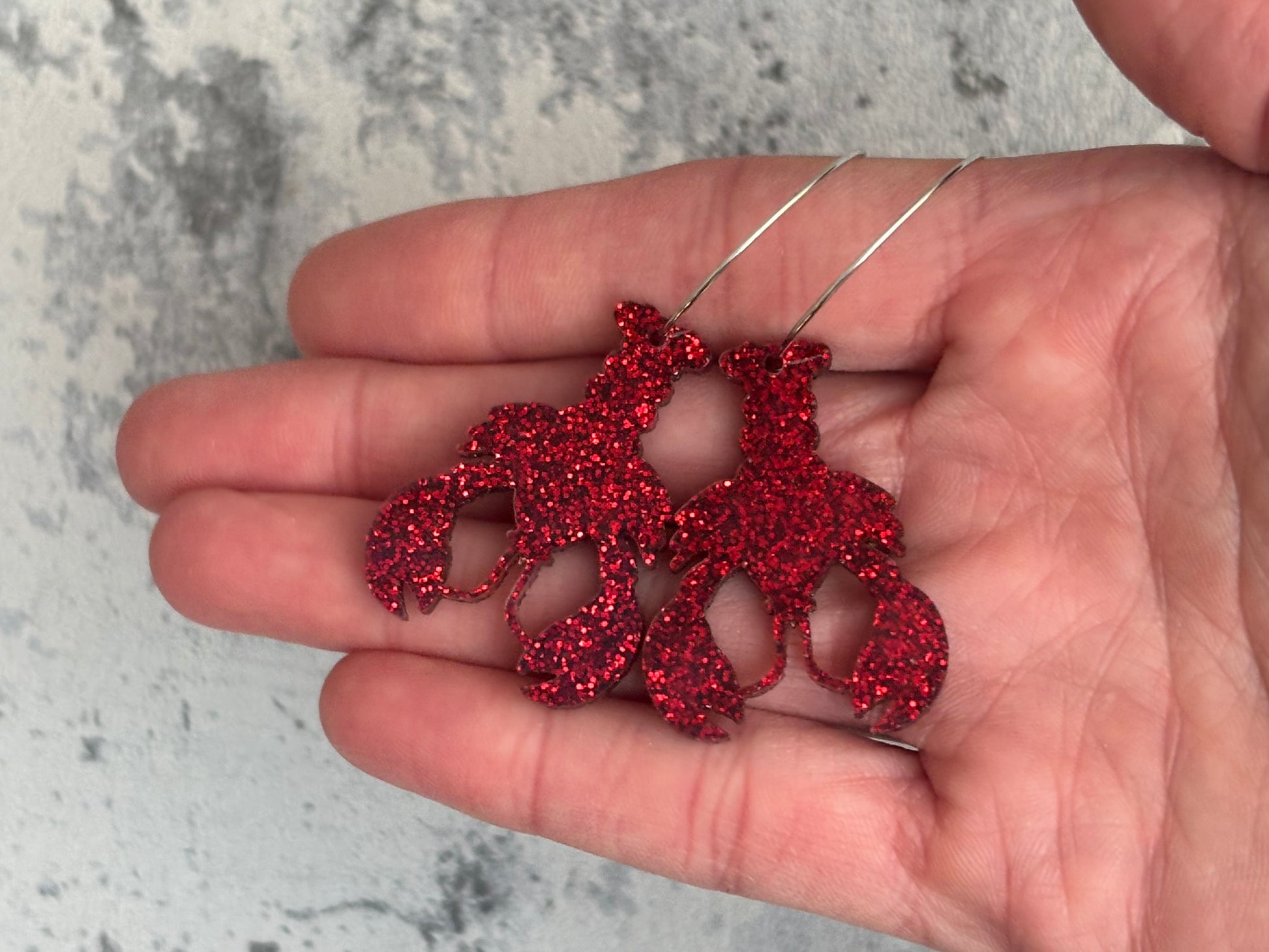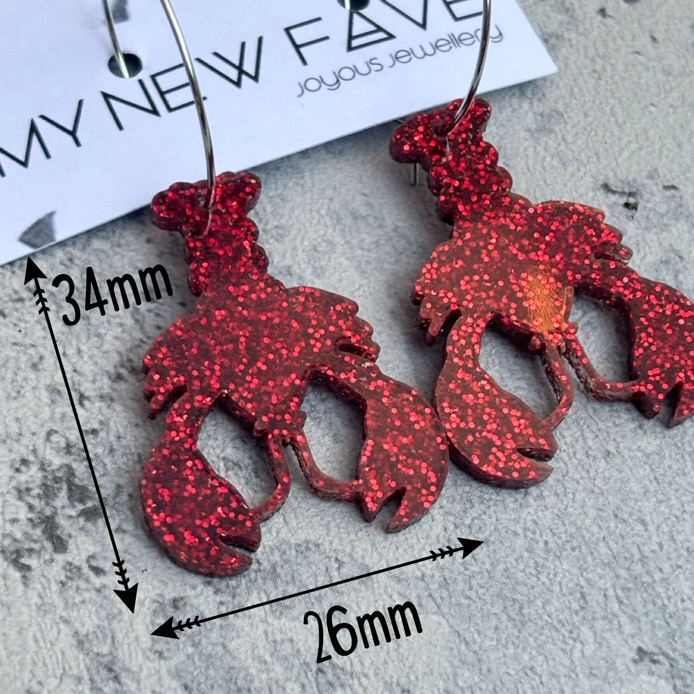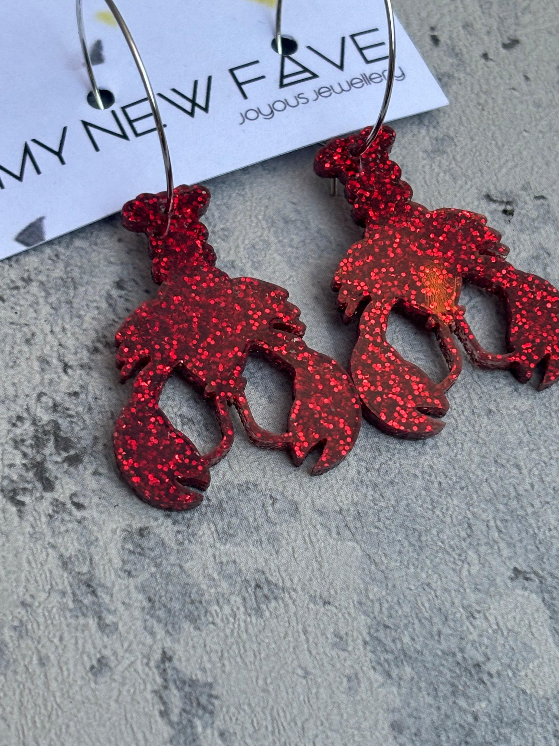 These earrings come In the shape of a lobster, these gorgeous earrings are made from laser cut acrylic in a gorgoeous sparkly red glitter and they hang from 25mm silver plated and nickel free hoops.