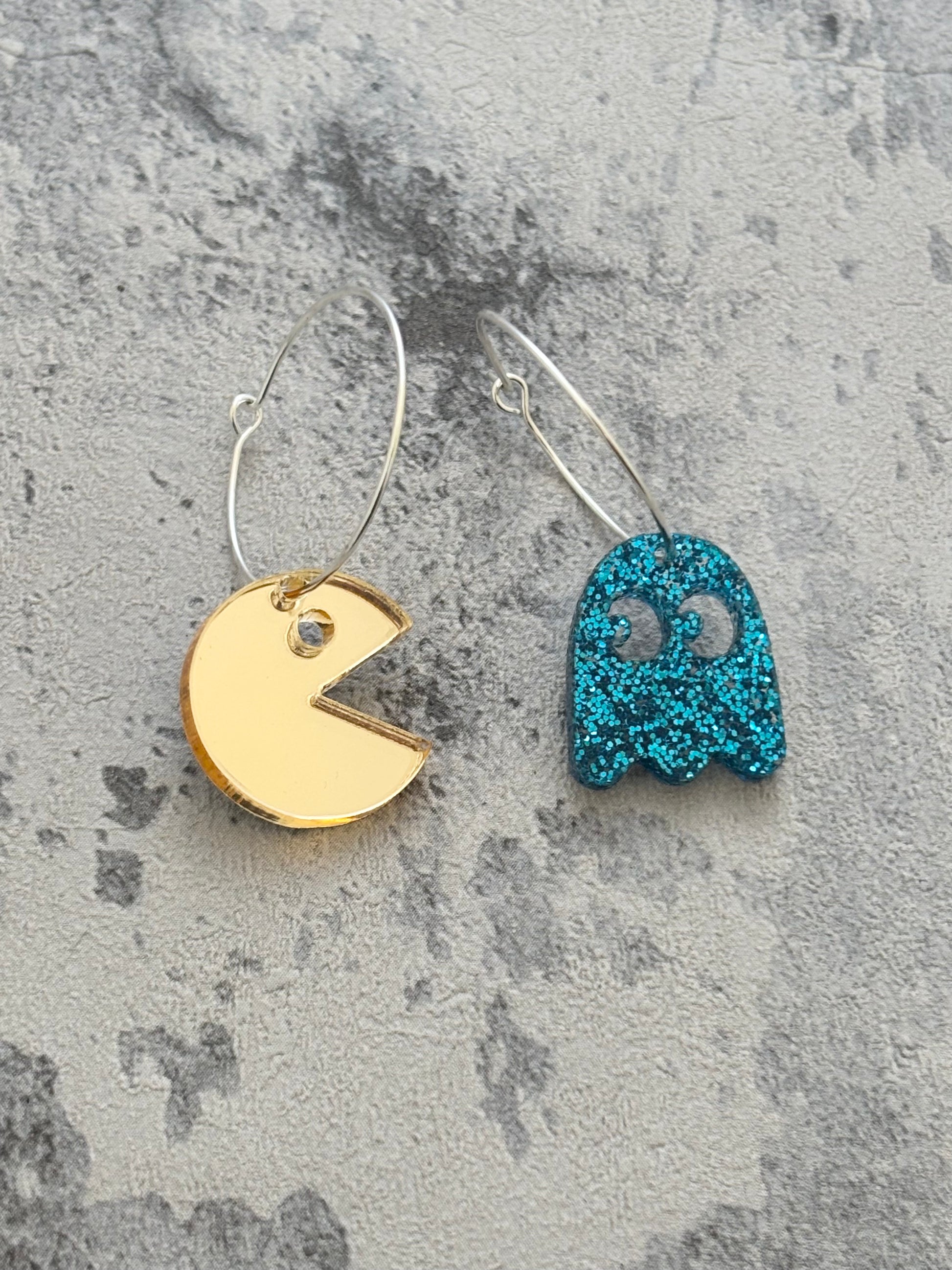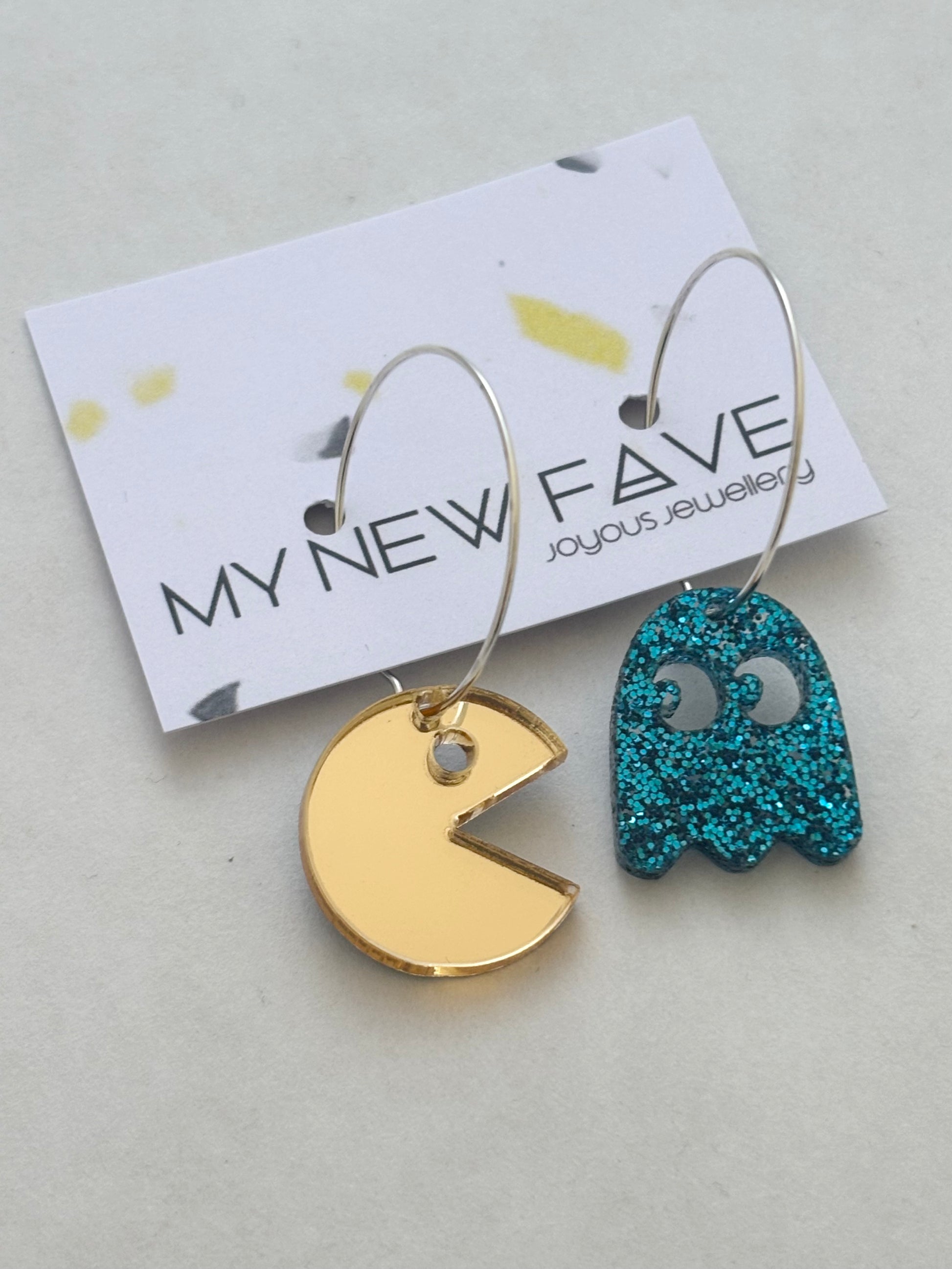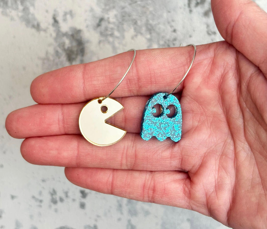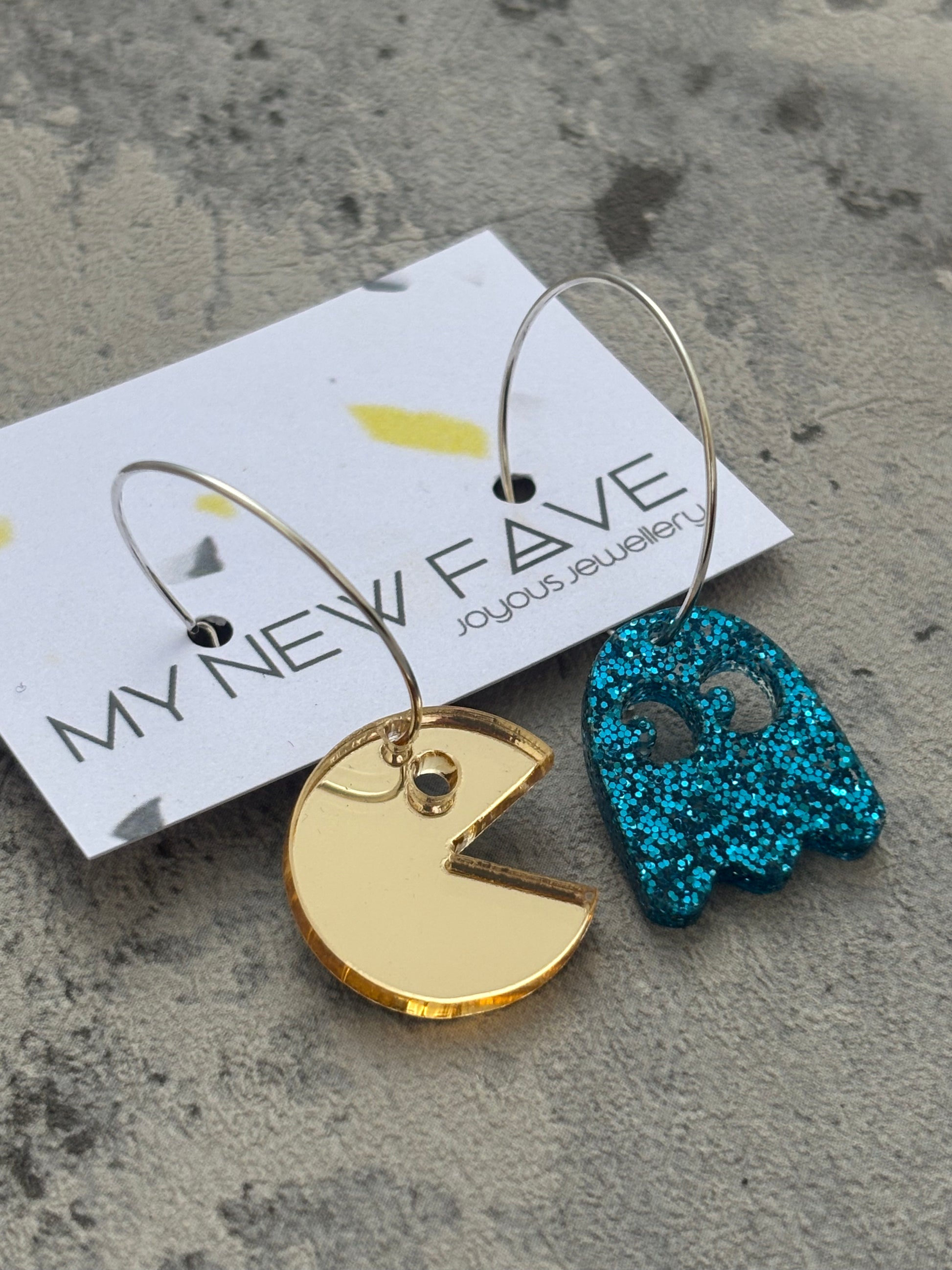 The characters themselves are reminiscent of the very popular retro video game from the 80's, they are made from laser cut gold mirror acrylic and blue glitter acrylic and are large statement earrings approx 20mm x 16mm x 3mm.