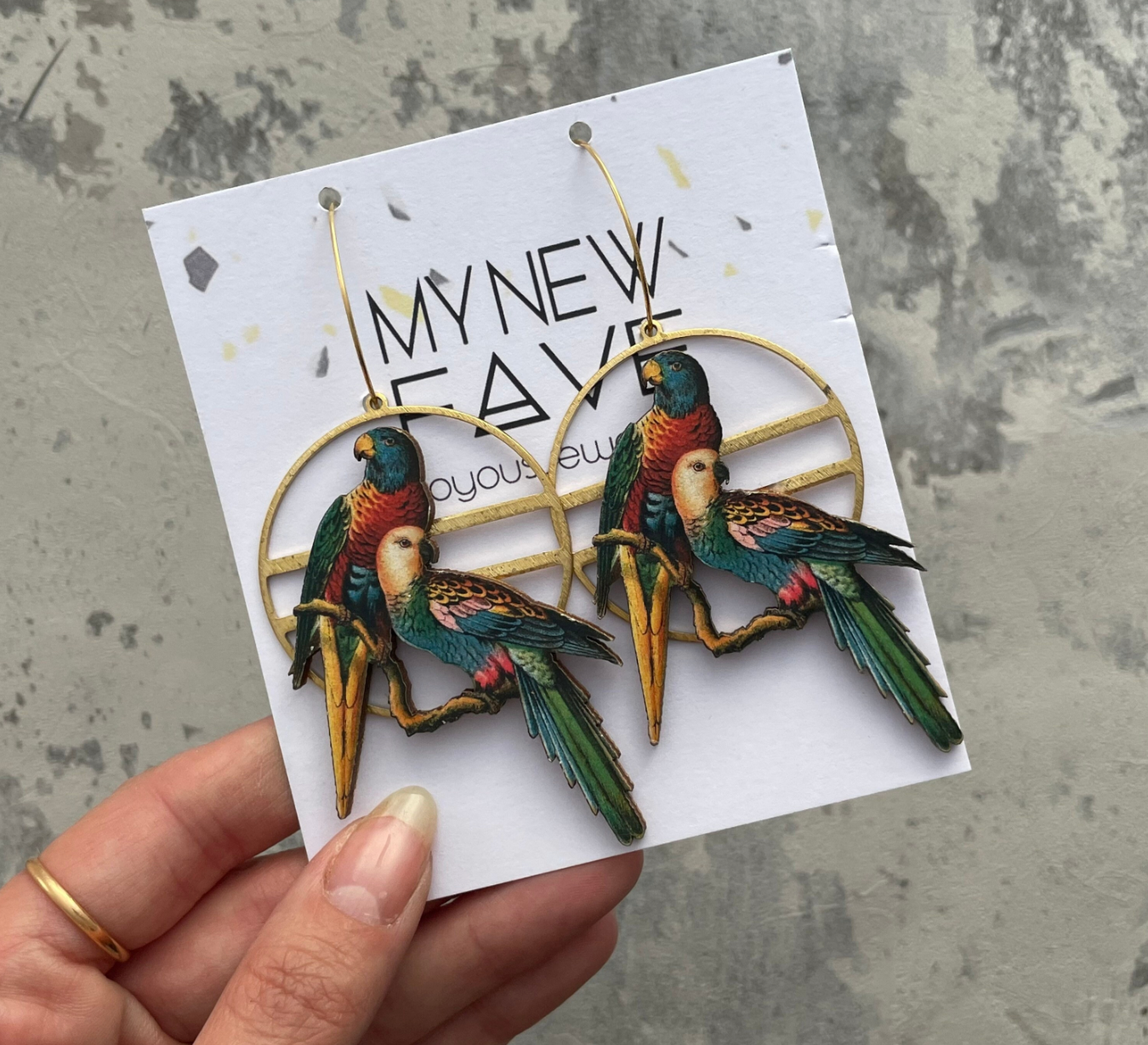 They are made from printed laser cut wood attached to gold coloured brushed metal circular shapes.